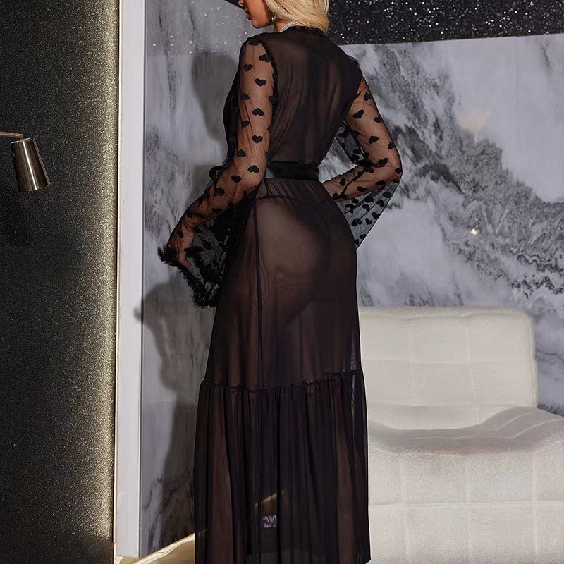 Woman Nightgown Trumpet Long Sleeve Mesh Nightgown Sleepwear Lace See me Through Robe lingerie